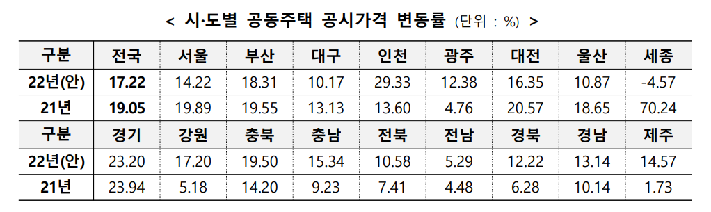 정부에서 공시지가 현실화를 선언했던 2021년도에는 아파트를 포함한 공동주택의 공시지가 상승률이 전국평균 19%를 넘어섰었죠. 올해는 작년보다 상승률이 1.83%포인트 낮아져 전국평균 17.22%를 기록했지만 여전히 높은 상승률이라고 할 수 있겠습니다.